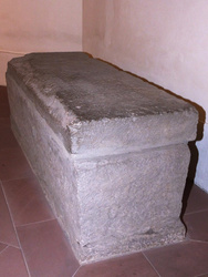 Die Vers-Inschrift auf der Sargplatte von Bischof Megingaud ist die älteste erhaltene Monumentalinschrift Frankens nach der Römerzeit und lautet nach Franz Xaver Herrmann: